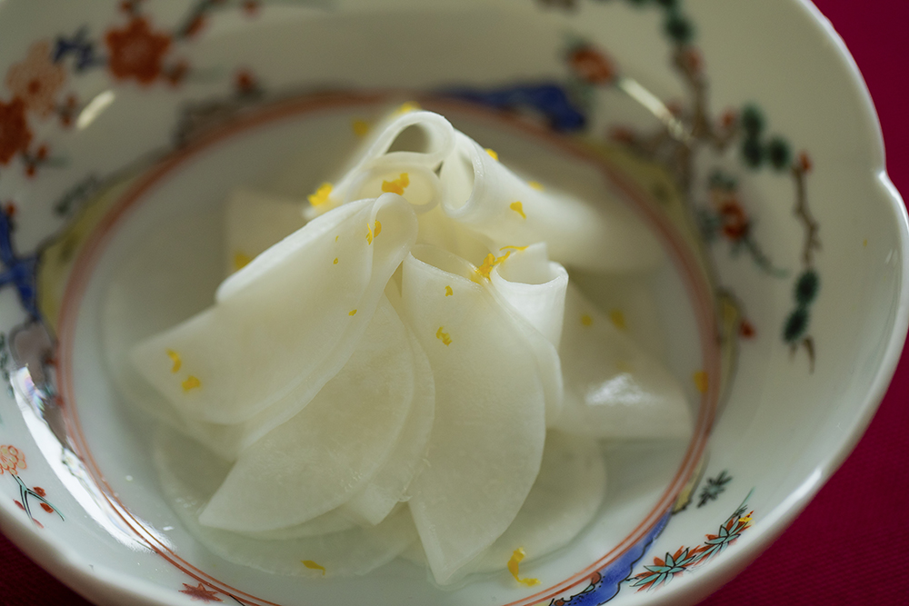 4.熱さがとれた甘酢に昆布と柚子の皮、それから水気をしぼった蕪を入れて1時間程度漬け込む