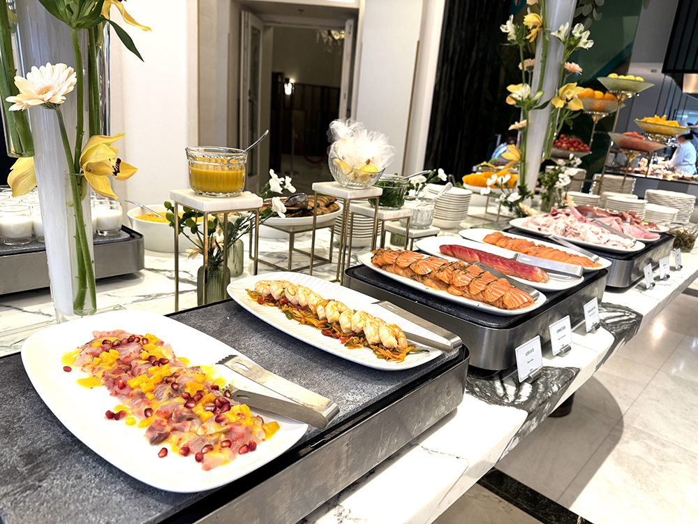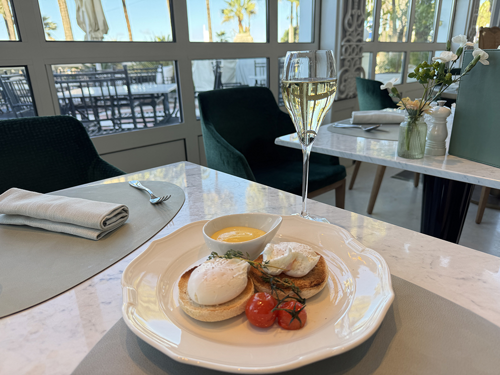 「リヴィエラ・レストラン」はフランスのブラッスリーの定番料理を味わえる。南仏やイタリアのタッチを加え皿や、上質な肉料理やその日の水揚げによる魚料理を提供。名物料理は地産の野菜を使った薄焼きタルト、アンチョビとキャラメリゼしたオニオンを薄いパン生地に乗せたピサラディエール、地中海産スズキのカルパッチョ(赤スグリ、レモンコンフィ、豆苗添え)など。ビュッフェ式の朝食も豪華!