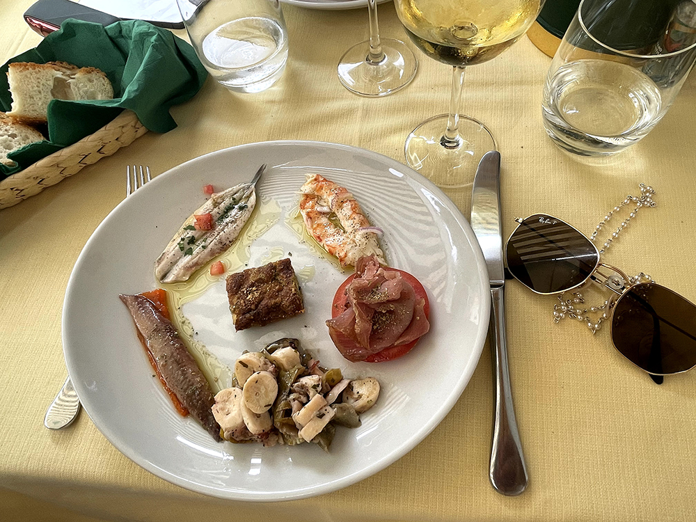 港沿いに佇むローカルに愛されるリストランテ タヴェルナ デル マリナイオはポルトフィーノで暮らす友人のお墨付きのレストラン。飾らないおしゃれな雰囲気がまた魅力的です。前菜にシーフードの盛り合わせとイカのフリットをオーダーしましたが、何を食べても満足の味でした。選んだワインはヴェルメンティーノ。美しい港を前にワインがすすみます。