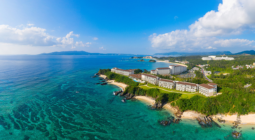 恩納村は2018年に「サンゴの村宣言」をし、2019年には「SDGs未来都市」にも選定され、まさにその同じ年に「ハレクラニ沖縄」が開業に至りました。 沖縄本島の西海岸中央部に位置する村は、沖縄きってのリゾートエリアでもあり、海洋学術的にも貴重な自然が残るエリアと言われています。そんな原形を残す美しいサンゴの海を目の前に「ハレクラニ沖縄」は静かにゲストを受け入れています。