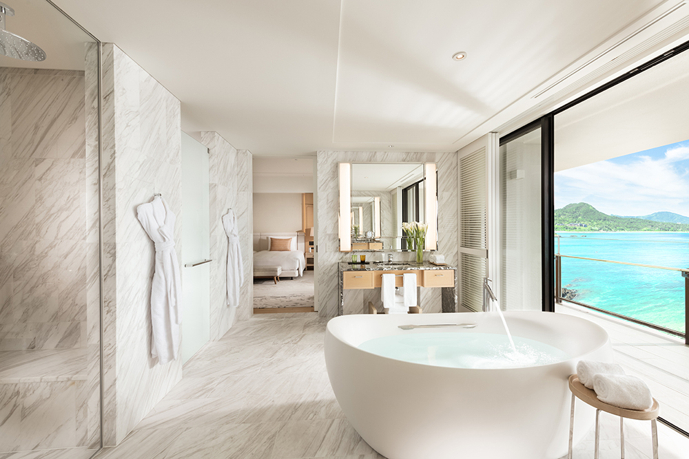 サンセットウイングに位置するエグゼクティブ オーシャンフロント スイート(76㎡)。広々としたリビングやバルコニーから眺める素晴らしい景色は感動的。