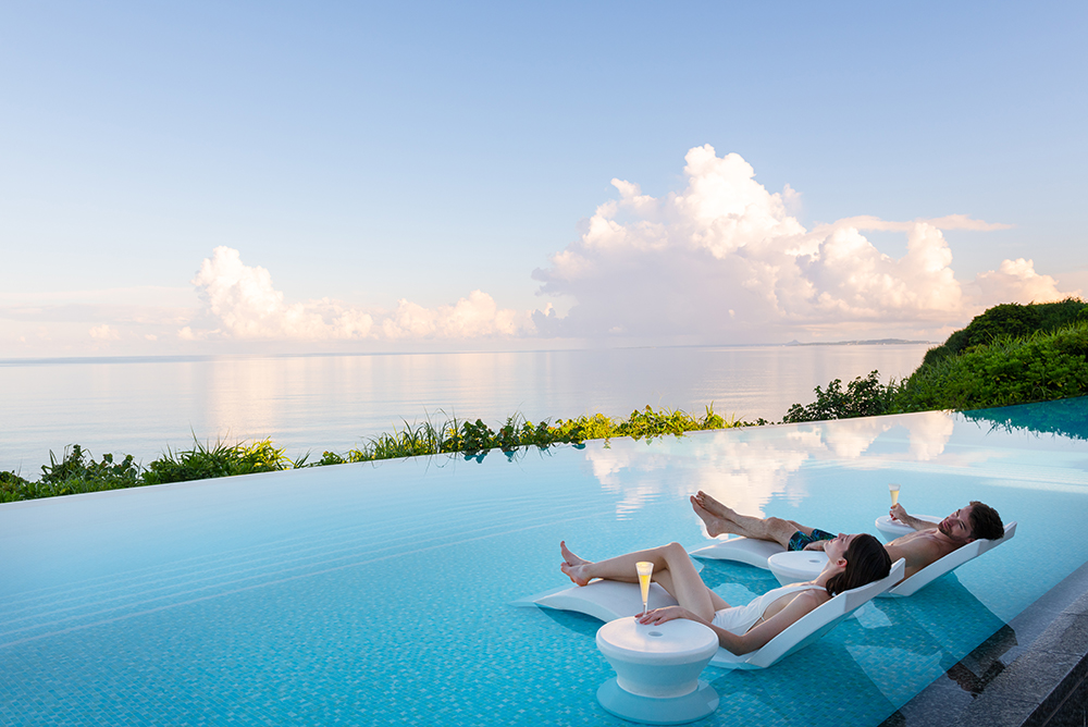サンセットウイングにある、インフィニティのオーシャンテラスプール。日の昇る頃から夕暮れ時まで、海と共に静かな時を楽しめるプール。