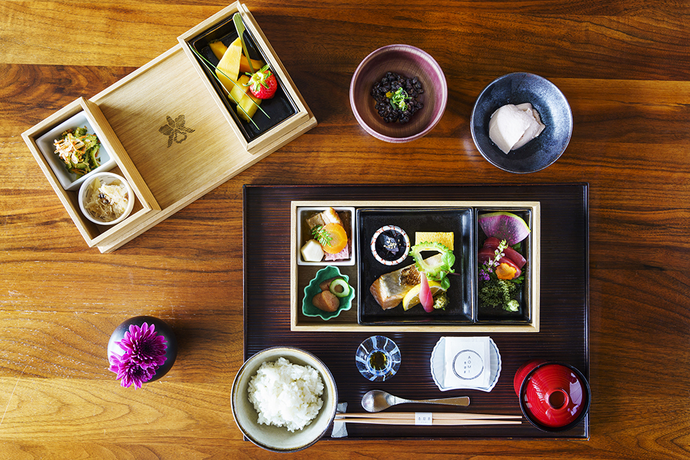 朝食は和朝食が楽しめる日本料理「青碧蒼」(AOMI)と、テーブルサービスの洋朝食を提供する「SHIROUX」がある。写真はAOMIでの和朝食の一例。