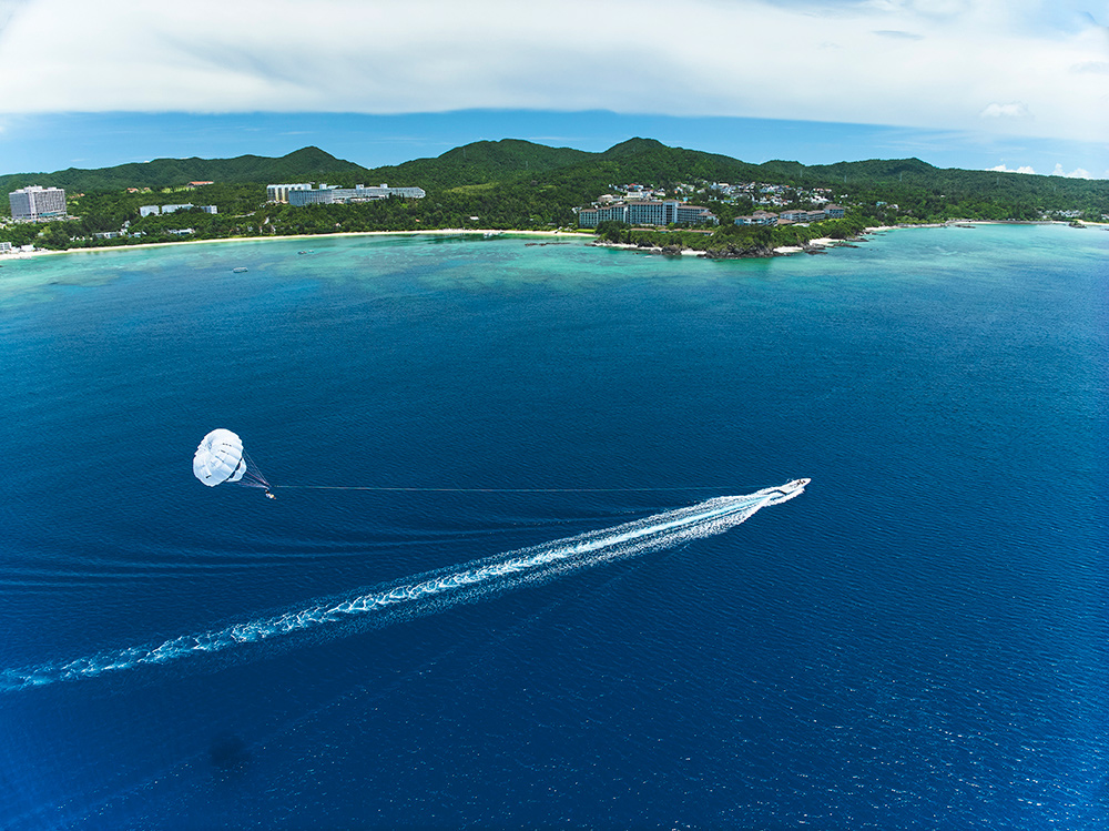 青い海の上を飛ぶパラセーリングは人気のアクティビティ。ボートからそのまま飛び立ち、着水せずにボートへ戻れるため濡れる心配なく快適とか。