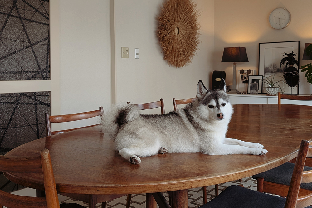 書き物をする場所、ダイニングルームのダイニングテーブルも時には占領されます。特に暑い日には、木の表面が冷たくて気持ち良いようで、2匹揃ってテーブル上で昼寝をすることも。