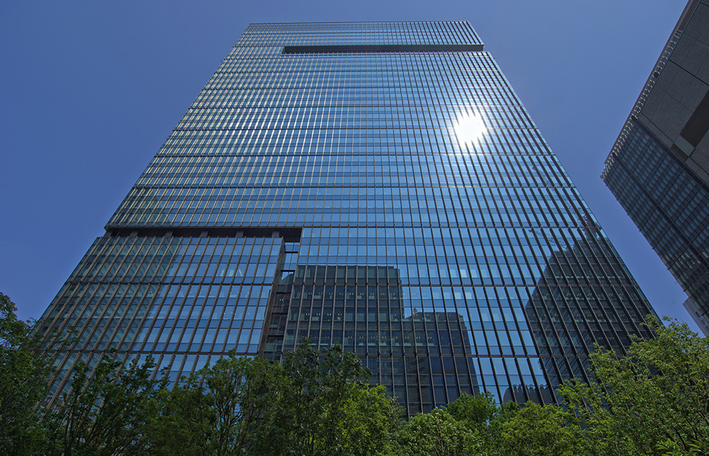 大手町タワーの全貌。下に見える緑の木々は‘大手町の森’の一部でビルの一面に寄り添う都会のオアシス。