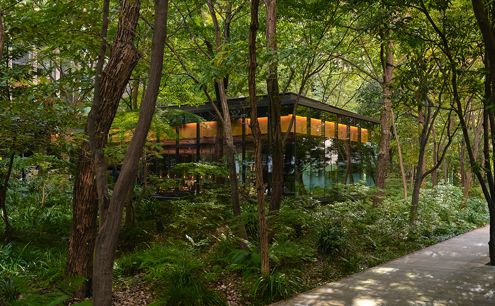 実は「アマン東京」の入る大手町タワーの麓には3,600㎡の森が広がっています。東京都心では稀有な本物の森であり、‘大手町の森’と呼ばれ、自然の生態系を有し野性を併せ持っているのです。資料によれば、この森はホテル造りの3年前から森の一部(1,300㎡)を千葉県君津市の山林で土壌や植物、適切な管理方法などを検証しながら育成・改良を重ね、大手町に移植したという‘プレフォレスト手法’でできた森なのです。夏になればセミが鳴き、様々な鳥や昆虫が生息…紅葉までも楽しめる四季を持つ森です。今では木々も当時より随分と育ち、暑い都会の夏でも、涼風の通る木陰が快適な憩いの場として親しまれています。