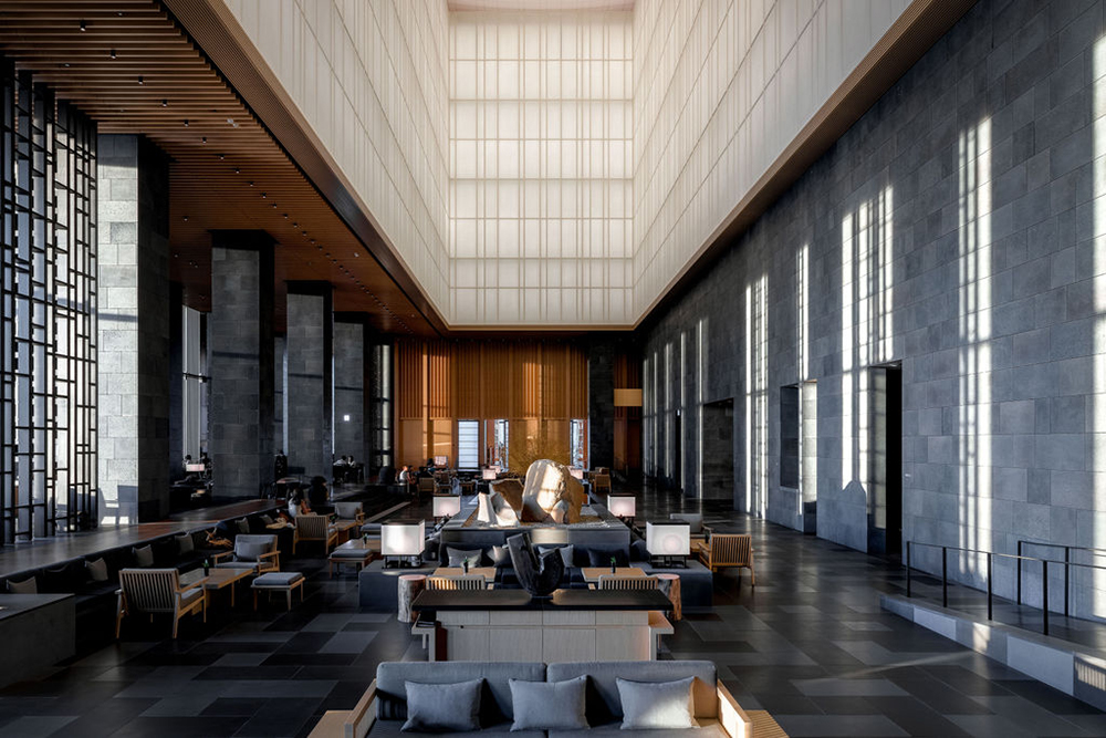 ガーデンラウンジは縦40m、横11m、高さ30mの吹き抜けが話題。和紙で覆われたガーデンラウンジの行灯(吹き抜けの壁)は圧巻。自然光と間接照明の違いが美しく融合され、温かな光がゲストを包みこむ。
