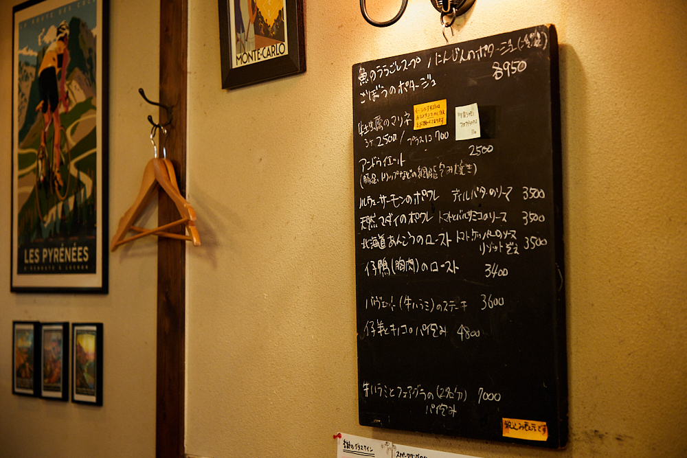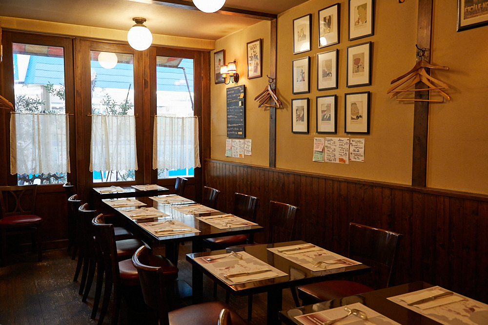 それから20年。古色のついた床に、丸くなったテーブルの縁、壁にはフランスのポスターなどが飾られ、パリの老舗のビストロのような風情を醸し出している。