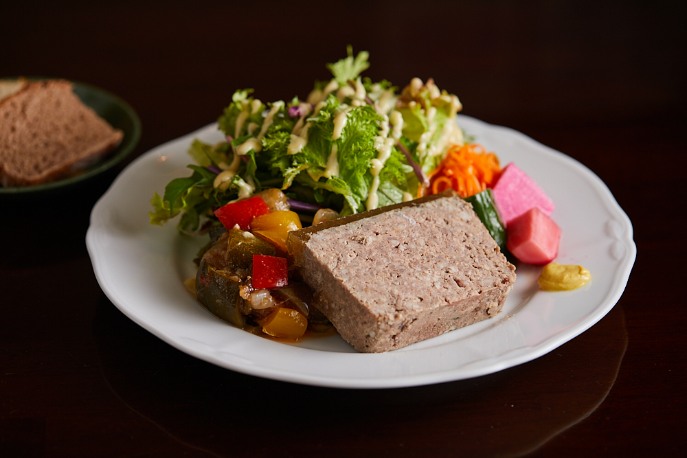 豚肉と鶏レバーの濃厚な味わい。付け合わせには自家製のピクルスや生野菜など野菜たっぷりもうれしい。