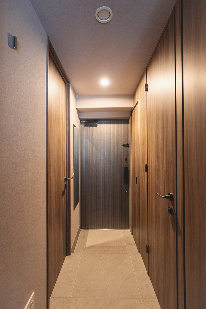 デザインも本当に素敵ですよね。壁と床の色を3パターンから選べたのですが、この壁のグレーの色味が気に入りました。ほかのマンションもいろいろと見ましたが、こういった色の組み合わせはありませんでしたね。床材も雰囲気が良くて、玄関から廊下のタイルの感じもすごく好きです。