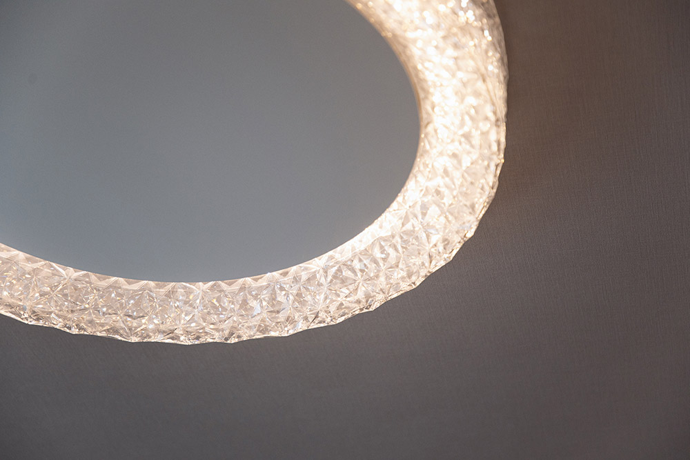 特にライトに関してはすごく悩みました。ペンダントライトも良かったのですが、圧迫感があるかなと考えて。やっぱりシーリングライトを選んでよかったと思います。このライトは調光もできて、夜、ガラスの陰影が天井に映るのがすごくきれいなんですよ。