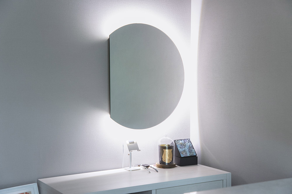 コーディネーターさんにおすすめしてもらった特徴的な形の鏡も気に入ってます。照明がついていて、化粧台みたいに使えて便利ですね。 またこれもおすすめしてもらったのですが、エアコンがアプリで操作できるのがすごい便利で。今年、暑かったじゃないですか。帰る前にスイッチを入れておけますし、猫を飼い始めてからは、仕事中も外から温度をチェックできるのが安心です。