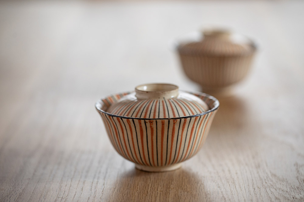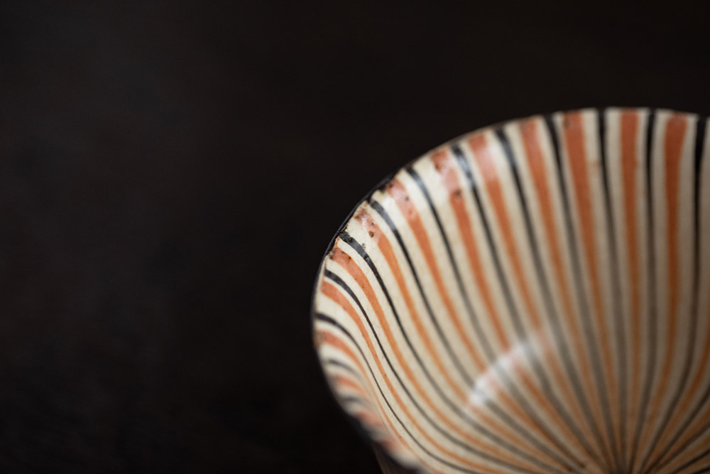 今回の器は、民藝としてよく知られている瀬戸麦藁手(むぎわらで)茶碗だ。江戸時代後期に瀬戸の品野や赤津で作られ、規則正しく縦縞が2色で交互に描かれており、その模様が麦の穂のように見えるから麦藁手と呼ばれるようになった。初めて麦藁手を知ったのは、白洲正子さんの手元にあった食器として、学生時代に写真を見たのがきっかけだった。それからなんとなく心の片隅にあって、古美術の即売会の際には意識して探すようになった。ただ民藝と言われるだけあって、ちょっと骨董臭いというか味が染みすぎているものも多く、同じ麦藁手でも骨董っぽすぎないものとの出会いを待ってようやく手に入れた。普段は古染付や青磁など、比較的線のきりっとした器を使うことが多いので、麦藁手は私の手持ちの器ではイレギュラーなものかもしれないが、温かみがあってこれから寒くなる季節に使いたくなる一碗だ。