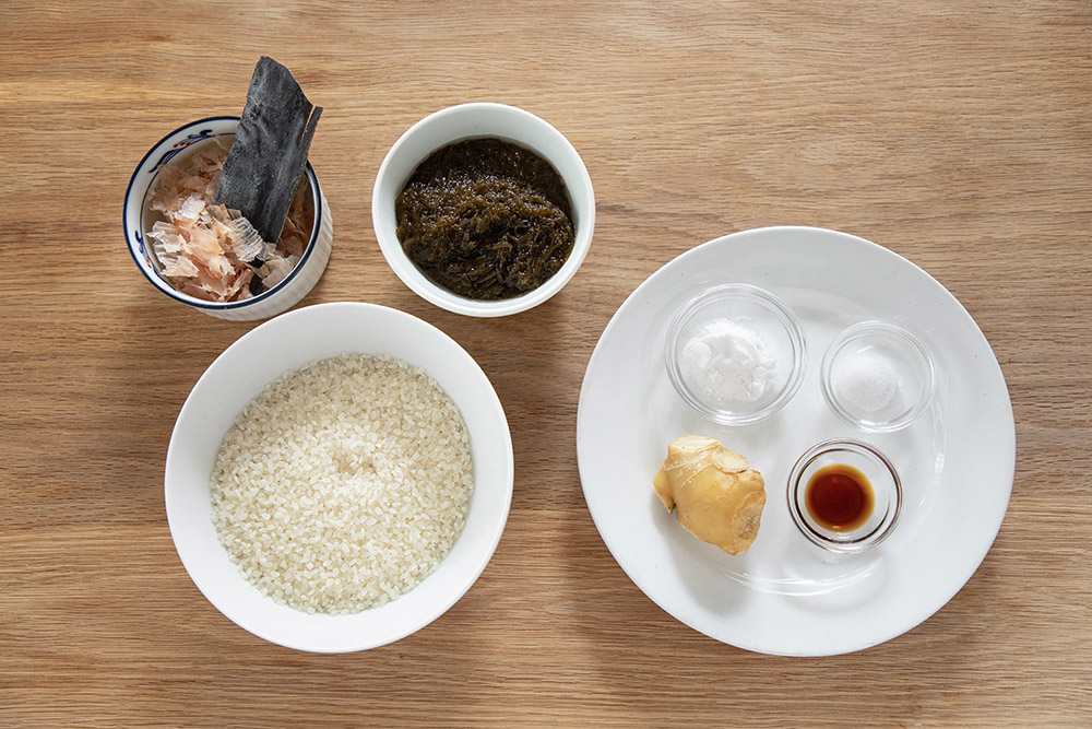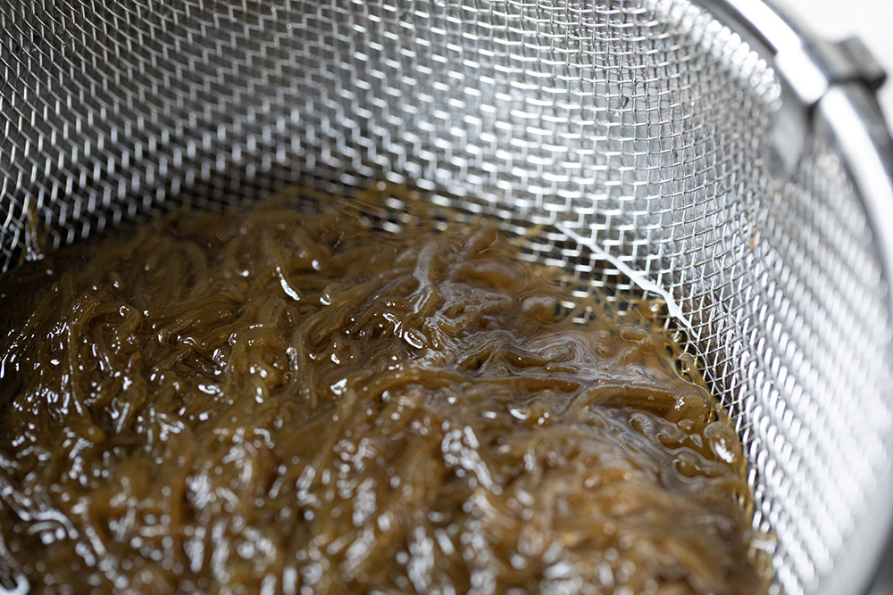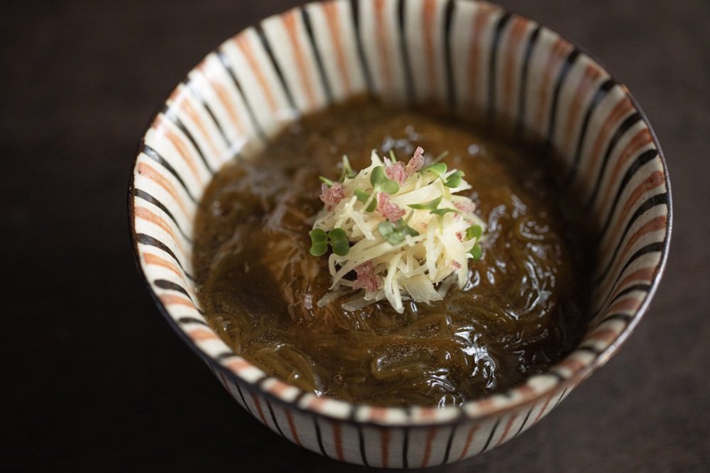 盛り付けたのは、もずくの餡かけごはんだ。11月は収穫に感謝する新嘗祭があり、この季節は新米をいただくことが何よりの楽しみでもある。香りが良くて甘く、みずみずしく、おかずなどなくても、お米それだけでも充分である。とはいえ、様々なバリエーションでも新米を楽しみたいと思い、レシピを考えた。秋から年末年始にかけて、食材は美味しさを増す一方で、私たちの体の代謝は落ちて太りやすい時期でもある。そこで体に優しいものとして、もずくを温かい餡かけ仕立てにした。もずくはワカメや昆布と同じ褐藻類で、同じ海藻にくっついて育つことから藻着く(もずく)と呼ばれるようになった。現在は養殖が盛んで、全国シェアの9割以上は沖縄県で育てられているそうだ。今回は早摘みのものを使用した。これは一般的な収穫時期より早めに摘んだもので柔らかいことに特徴がある。もずくにはフコイダンというヌメリの成分が他の褐藻類よりも豊富に含まれており、炎症を軽減してくれたり、免疫力を上げてくれたりと健康に寄与することは間違いなさそうだ。更に抗菌作用の高い生姜をたっぷり使うことで、美味しいと同時に風邪に負けない体づくりにも期待したい。