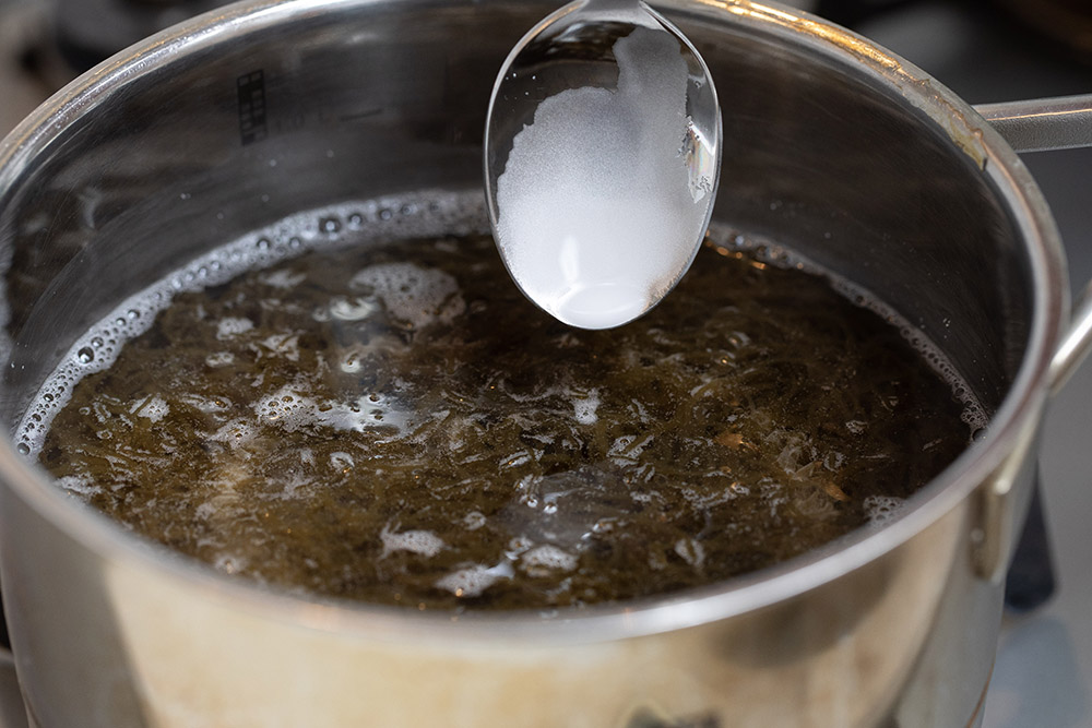 5、3の出汁に水切りしたもずくを入れて、4で少しずつとろみをつける。