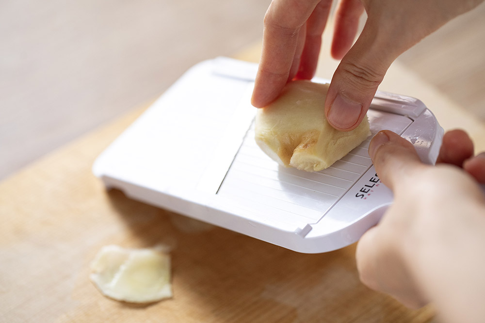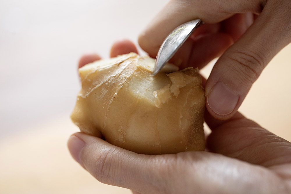 6、生姜はスプーンを使って皮をこそげる。それから繊維に沿ってスライサーで薄くし、さらに繊維を断ち切るように細切りにする。
