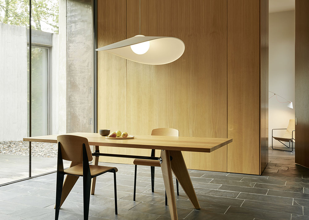 この円筒状の照明は糸を素材に吊るすことで光の彫刻 をつくるという、技術的かつ詩的な照明です。吹き抜けや階段室などの高さのある場所はもちろん、リビングに吊るすことで光がぐっと床面近くまで降りてきて、落ち着きを生み出します。