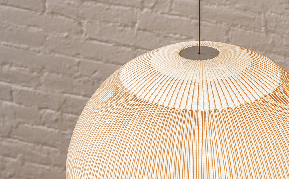 冒頭の写真で紹介した照明はライクラという化学繊維で編まれた生地を使った、光を柔らかな編み物で包んだような照明です。生地の畝目から光が全方向に広がります。