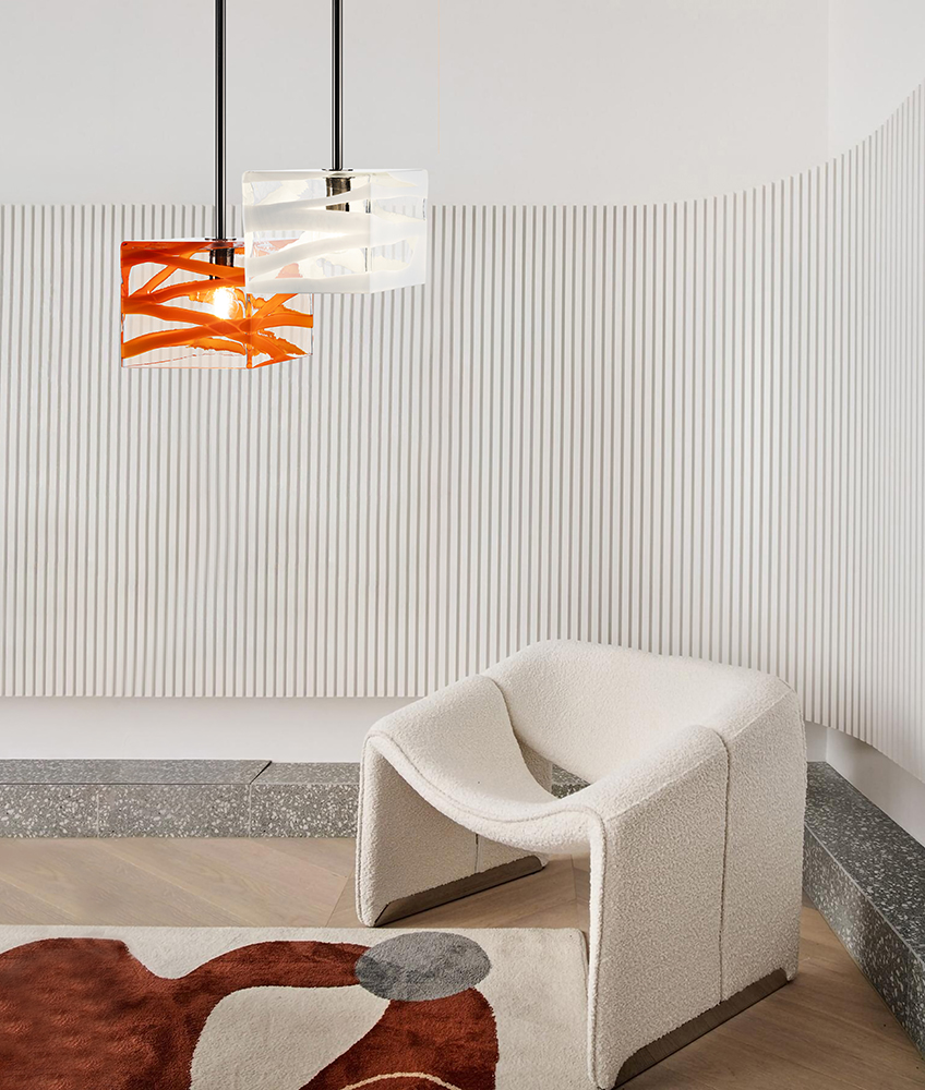 形や色の強い照明は、求心力を持ちます。この照明はガラスのオブジェで知られるイタリアのブランドの新作ですが、部屋のコーナーにアームチェアとアクセント照明をペアリングさせると、あっという間にリラックスコーナーになります。これはブロック状の多層の透明ガラスに、色を帯状に巻きつけたデザイン。そのままリビングのオブジェになりそうですが、調光もできるしっかりとした照明です。