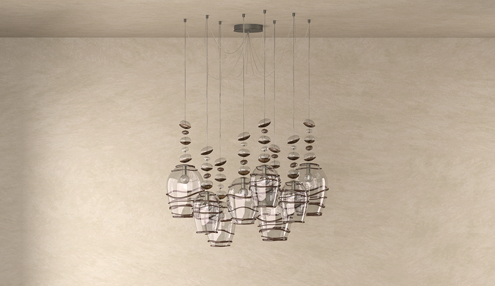「リビングにシャンデリア」は定番ですが、多灯吊りでシャンデリア以上の演出が楽しめる時代になりました。これも上と同じブランドの照明ですが、現代建築家のデザインによるガラス照明をランダムに釣ることで、華やかでかつモダンな印象が生まれます。