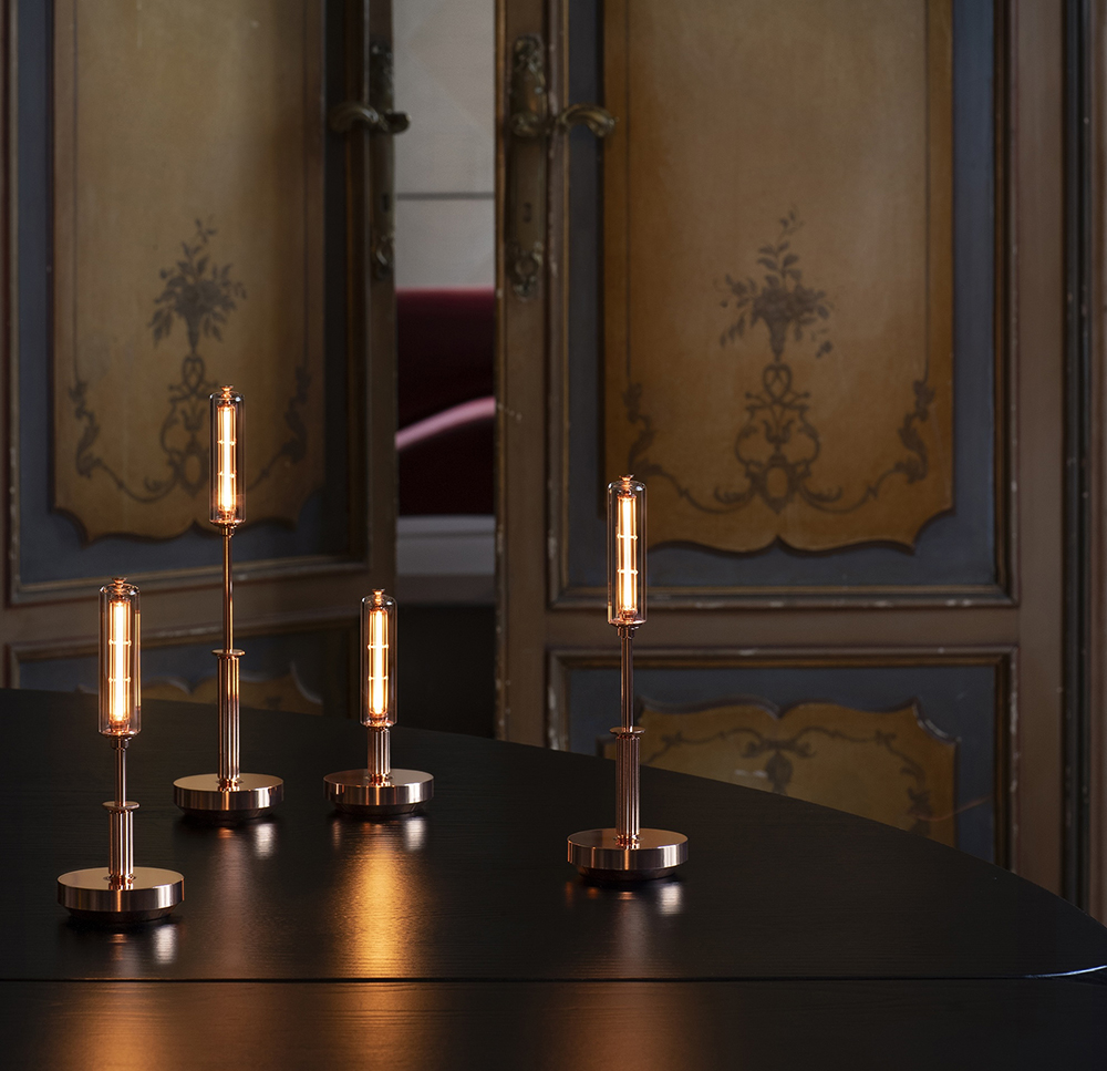 下はワイヤー状の細い光源をパイプのようなガラス筒に納めた、デリケートな照明。ヨーロッパの古い街灯や教会、歴史建築に見られる柱や装飾のディテールをモチーフにしています。