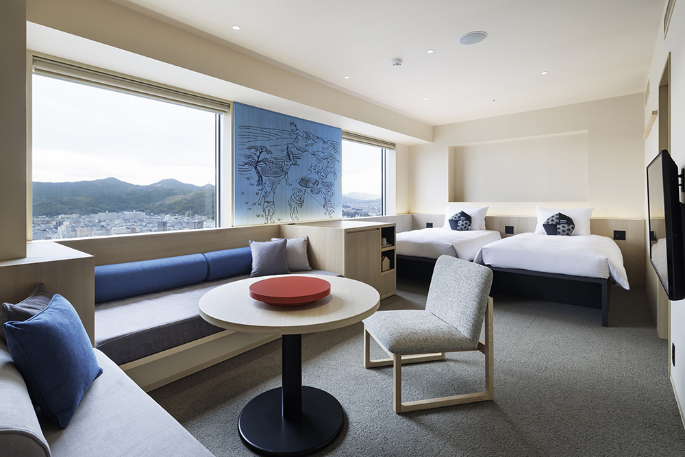 ホテルは22階建てです。客室は7階~21階を占め、全客室数8タイプ、133室。そのうち愛犬と泊まれる部屋(ドッグフレンドリークィーンルーム)が3室揃っています。そしてここにも他の「OMO」同様に、1階には滞在の拠点となり、皆が集える「OMOベース」があり、高知市のイラストマップやよさこい祭りの舞台、夜は観客席となる大階段、ライブラリー、OMOカフェ&バルなど、吹き抜けで開放感のあるスペースは彩り豊かでテンションの上がる快適な空間です。