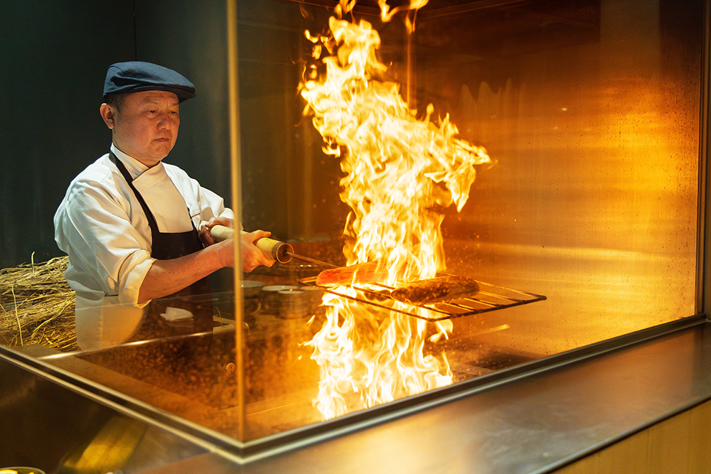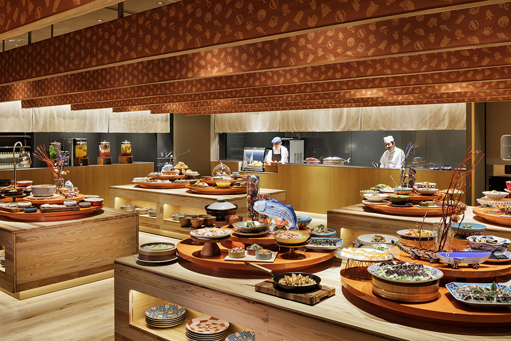 レストラン「OMOダイニング」は2階にあり、郷土料理をたっぷりと披露するビュッフェスタイルが楽しめます。特に夕食時に目の前で仕上げる‘カツオの藁焼き’や‘ローストビーフ’は一番人気。ダイニングもこれまでの施設のように個室ではなく、敢えてみんなで集まる宴好きの高知の地元の人々のように、ワイワイと食文化を堪能する広いダイニングが用意されています。