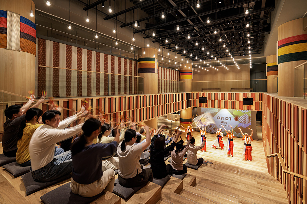 「テンションあがる『街ナカ』ホテル」がコンセプトの「OMO」のひとつとして、「OMO7高知」は2024年6月13日に創業しました。土佐のおきゃく文化に敬意を払い、その伝統を踏襲し、高知でのコンセプトには「こじゃんと楽宴 さぁ、夜さ来い!」と掲げられました。高知のおきゃく様文化を体験できるよう、様々に工夫がされています。‘こじゃんと’は土佐弁で目いっぱいの意味があり、‘夜さ来い(よさこい)’は高知を代表する「よさこい祭り」で、高知独特の宴会文化から着想を得ているもてなし方といいます。そのよさこいの語源は、まず「夜さ来い(夜にいらっしゃい)」という古語が変化した言葉。そして、高知県の民謡「よさこい節」が基となり、戦後の不況下に地域振興を願いながら、1954年に高知市で始められた「よさこい祭り」の略称として使われるようになりました。パワフルな祭りの裏側には、未来を見据えた高知市民の熱い願いが込められていたのです。