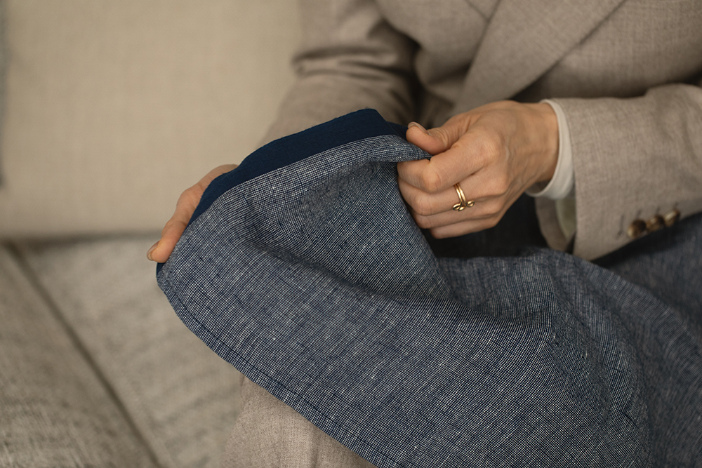 先に糸を染め、その藍染めの糸を縦糸に、横糸には生成りのリネンを使って織ります。そうすると、縦と横の色が混ざり合って“シャンブレー”と呼ばれる独特の表情の生地になります。古いシャトル織機で織るので、端に“セルビッジ(耳)”が生まれるんですね。ジーンズの耳付きのようにヴィンテージ感のある特徴的な部分で、あえてその耳を残して仕立てています。触れると本当に気持ちよくて、「これでパジャマを作りたい」と思うほどです。