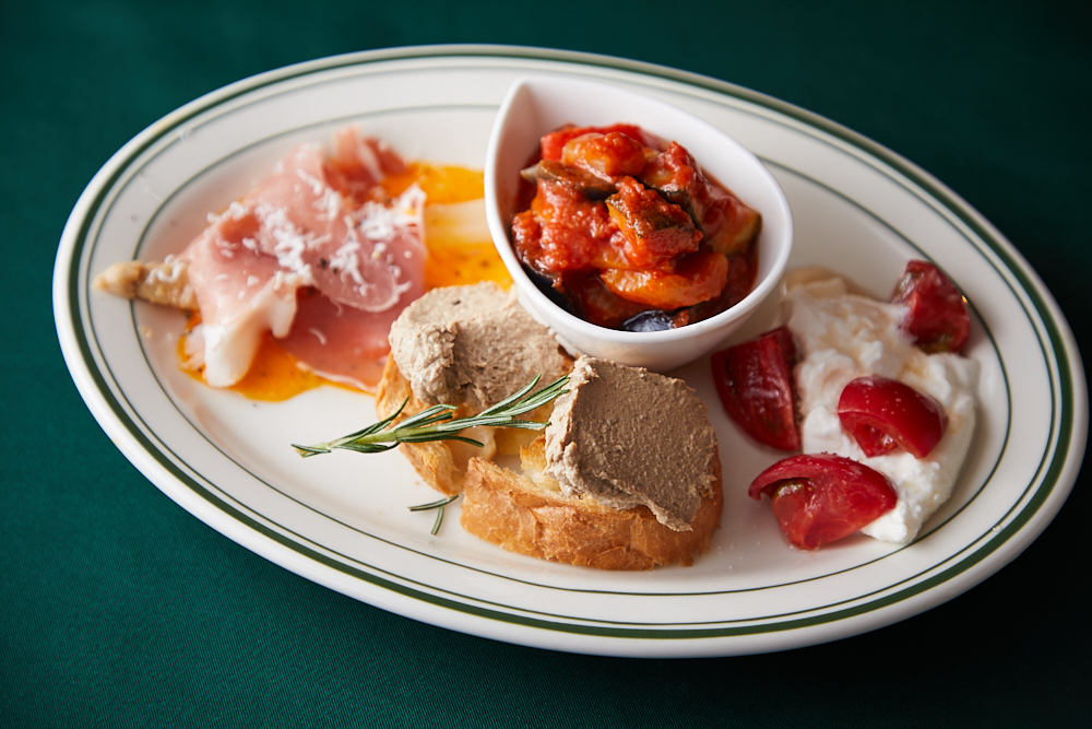 トマトとブッラータチーズのカプレーゼ、鶏レバーのクロスティーニ、ホワイトアスパラ生ハムのせ、カポナータ。彩りもきれいな盛り合わせはワインと一緒に。