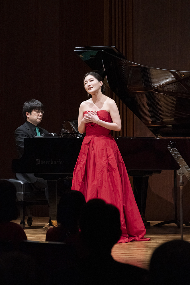 ソプラノと一口に言っても、実はそこには細かな分類があることも知ることができました。田中さんはソプラノのなかでも「コロラトゥーラ」と呼ばれる声質の歌手。コロラトゥーラは非常に高い音を要求されるジャンルで、駆け抜けるようなパッセージをなめらかに表現する技巧も必須。時にコミカルにもキュートにも響く歌声は、鳥の囀りに喩えられることもあります。田中さんはそのコロラトゥーラとして、抜群の表現力とスキルを持ち合わせる歌手です。この日披露したデラックァの「ヴィラネル(田園詩)」では、その明るい響きはまさに小鳥たちが群れとなって、大空を上に下にとダイナミックに飛行する様を表し、アリャビエフの「夜鳴きうぐいす」はまさに鳥の囀りを思わせるロシア語の歌。その歌声はまるで異国の景色を映し出すかのようにファンタジックです。音楽とは、イマジネーションの旅に誘うものでもあります。