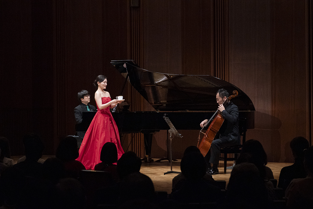 この日ステージを共にする、ピアノの佐藤さん、チェロの市さんは田中さんと同い年ということも明かされ、それもあってか、曲間のトークのやりとりもとても和やか。その空気のなか、前半の最後にはバッハの「ああ、なんて美味しいの、コーヒーは!(『コーヒー・カンタータ』より)」が披露されました。バッハといえば音楽の父と称される偉大な作曲家。そのバッハにも、こんなにコミカルで楽しい歌曲があったのです。田中さんの解説によれば、「バッハの時代にヨーロッパにもコーヒーが入ってきて、それが大流行し、飲み出したら止まらなくなるということで、ちょっとした社会問題にもなっていた」そうで、そんな世相を歌にしたものを(宗教的な題材で書かれたものを「教会カンタータ」と呼ぶのに対して)「世俗カンタータ」と呼ぶのだそう。このバッハの歌曲は、コーヒー好きの娘とそれを咎める父親とのコミカルなやりとりを描いたもので、そう聞くと、なんだかバッハがとても身近に感じられます。そのコミカルなカンタータを、田中さんはポットからカップにコーヒーを注いで飲み干す歌劇風のマイムを入れながら披露。とても楽しい一幕でした。