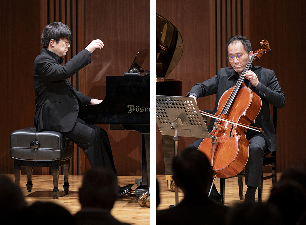 20分の休憩をはさみ、ブルーのドレスに着替えた田中さんが再びステージに登場すると、後半はクリスマスムードが漂う楽曲からスタート。シューベルト「アヴェ・マリア」での清冽なソプラノには心を奪われました。そして「続きましても、クリスマスらしい、教会らしい曲です」と田中さんが語れば、佐藤さんが「彩子さんもいろんな教会で歌われていたんですよね」と水を向けます。それを受けて田中さんは、ソプラノ歌手として駆け出しの頃を振り返り、「ウィーンのあちこちの教会から仕事を受けて歌っていました。たぶんウィーンのほとんどの教会で歌ったことがあると思います」と懐かしく語る場面も。そして披露したのが「天使の糧」。さらにウィーンでもよく歌ったというモーツァルトの「ラウダーテ・ドミヌム(証聖者の荘厳晩課より)」、さらにはパガニーニ/クライスラーの「ラ・カンパネラ」。「ラ・カンパネラ」では、日本でもおなじみのあのメロディが、チェロとピアノとで響き渡り、田中さんの母音唱が、それもひとつの楽器であるかのように美しいアンサンブルを紡ぎ上げていきました。