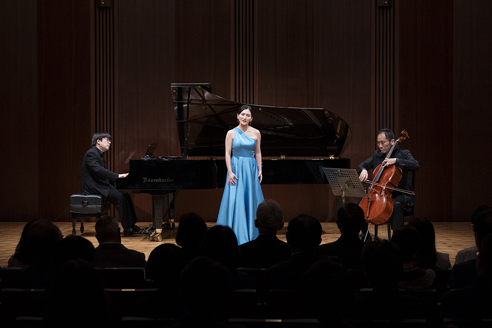 ラストは、ウィーンフィルのニューイヤーコンサートでもおなじみの、ヨハン・シュトラウス・2世「春の声」。この曲について田中さんが「実はオリジナルで歌詞がついています。なぜかあまり歌われないんですが」と語ると、佐藤さんが「というのも、(歌唱が)すごく難しいからなんです」と補足。そして田中さんは「『春』とは季節の『春』と言う意味だけではなく、辛いことや悲しいことがあっても、それがいつか雪解けて、春のように幸せな日が訪れるという思いも込められています」と解説。そして「非常に明るく、縁起の良い曲ですので、みなさまのご多幸をお祈りしつつ、この曲で締めたいと思います」と告げると、華やかで力強いチェロの音が鳴りわたり、ピアノが軽快なリズムを刻みます。田中さんのソプラノが、その音の上で春の訪れを寿ぐように明るく響き、透明感のある突き抜けたファルセットが暖かな陽射しのように会場を満たしていきました。言葉では説明しづらい、陽のエネルギーを受け取るような、まさに「縁起の良い」感覚。クラシックやオペラに馴染みがなくとも、誰もがこの歌声の表現力には圧倒されるはず。歌い終わり、3人がステージを去ってからも、大きな拍手は鳴り止まず。再びステージに登場したトリオはアンコールに応えてくれました。