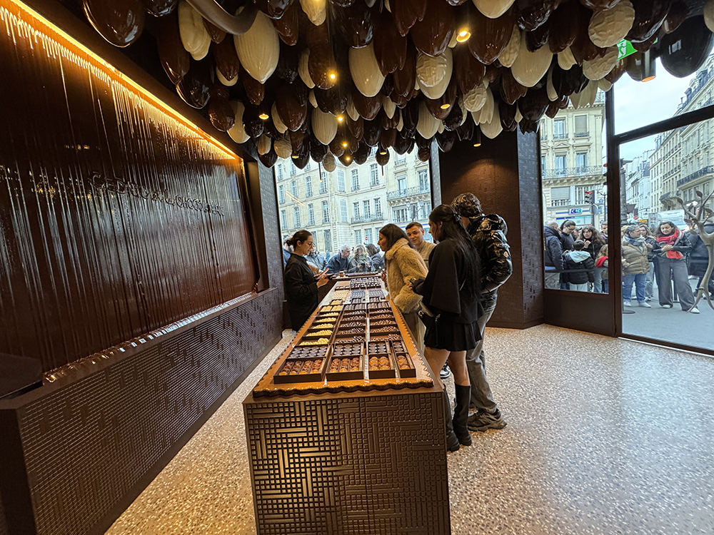 2025年10月のオープン以来連日行列が絶えない「セドリック・エ・ラ・ショコラトリー」。パリ2区、オペラ通りの角地に位置し、パティスリー「セドリック・グロレ・オペラ」はすぐそば。