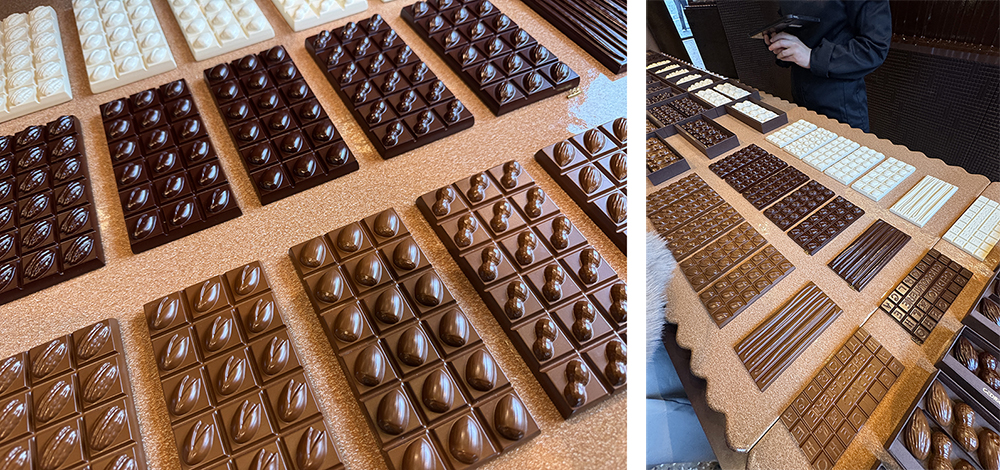タブレット・ショコラはミルク、ダーク、ホワイトの3種を展開。ピスタチオやピーナッツのプラリネ、インドネシア産バニラビーンズ入りのタブレットが好評。