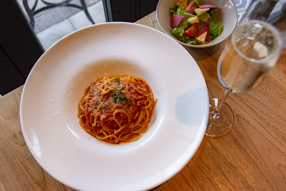 日替わりパスタとラザニアから選べるランチは、サラダ付き、提供は11時~16時。写真は、一番人気のアマトリチャーナ。グラススプマンテ1000円。