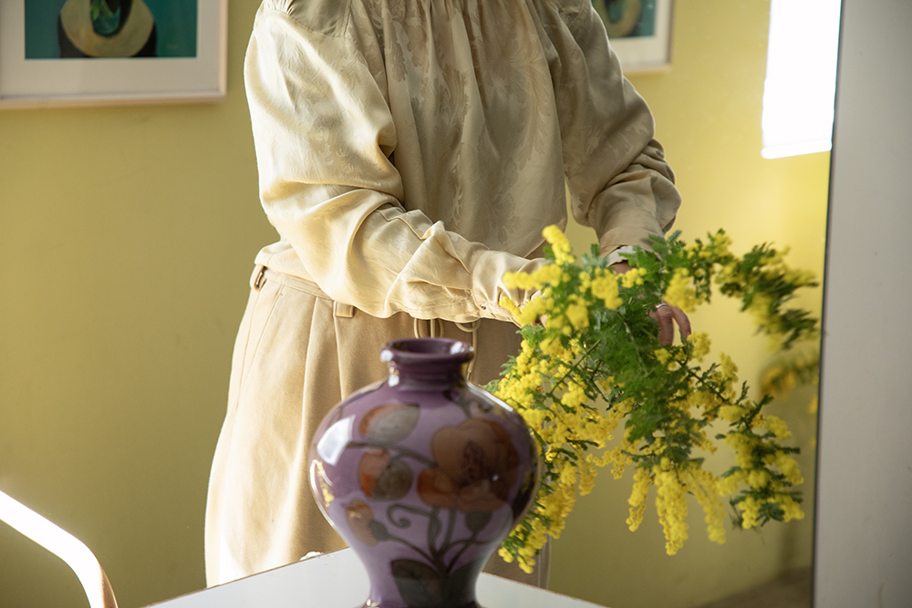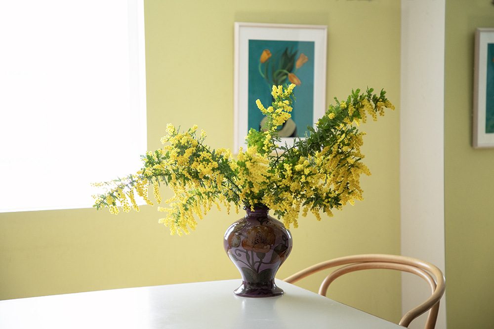 枝もののミモザは、いろんな場所に花が咲いていて動きがあるので、そのままザっと花瓶に入れるだけで、素敵にしあがります。