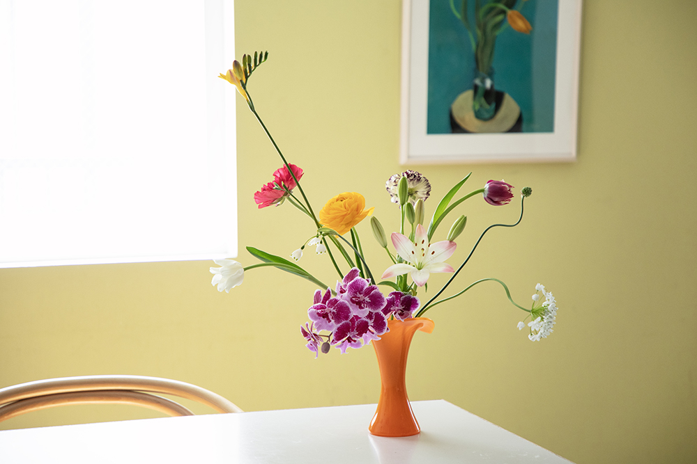 お客様からはよく「ちょっと今、部屋が散らかっているからお花はまた今度」という声を聞きます。でも、一輪でも花を飾ってみると「ちょっと片付けようかな」という気持ちになる魔法があるんです。花があると部屋の空気が変わって、生活に目を向けるきっかけになるものだと思います。花瓶がなくても大丈夫。空き瓶や、普段使っているコップで十分です。